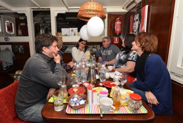 3. Mi többször jártunk a KözösStégen, abszolút tetten érhetők voltak az új enteriőrben az újra gondolás elemei. Az aránylag kis terekből kihoztátok a legtöbbet. A falakat mindig kortárs alkotások borították, a helyiségek, teraszok másfajta funkciókat kaptak. Az volt az érzésem, hogy a merev beülős hely helyett egy „érezd magad otthon, add ki magadból, csak létezz és legyél jól vagy éppen világosodj meg” érzetekre mentetek. Milyen céljaid, álmaid, terveid voltak mikor átsétáltál a hajó pallóján, és körbe néztél? Mi volt az első levegőbe szimatolásod és az ülünk a barátokkal, gyerekekkel a stégeteken között?