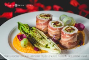 - Jércemell Java Baconbe Tekerve, Aszalt Paradicsommal És Füstölt Sajttal Töltve, Édesburgonya Pürével, Sült Római Salátával 2990.-Ft