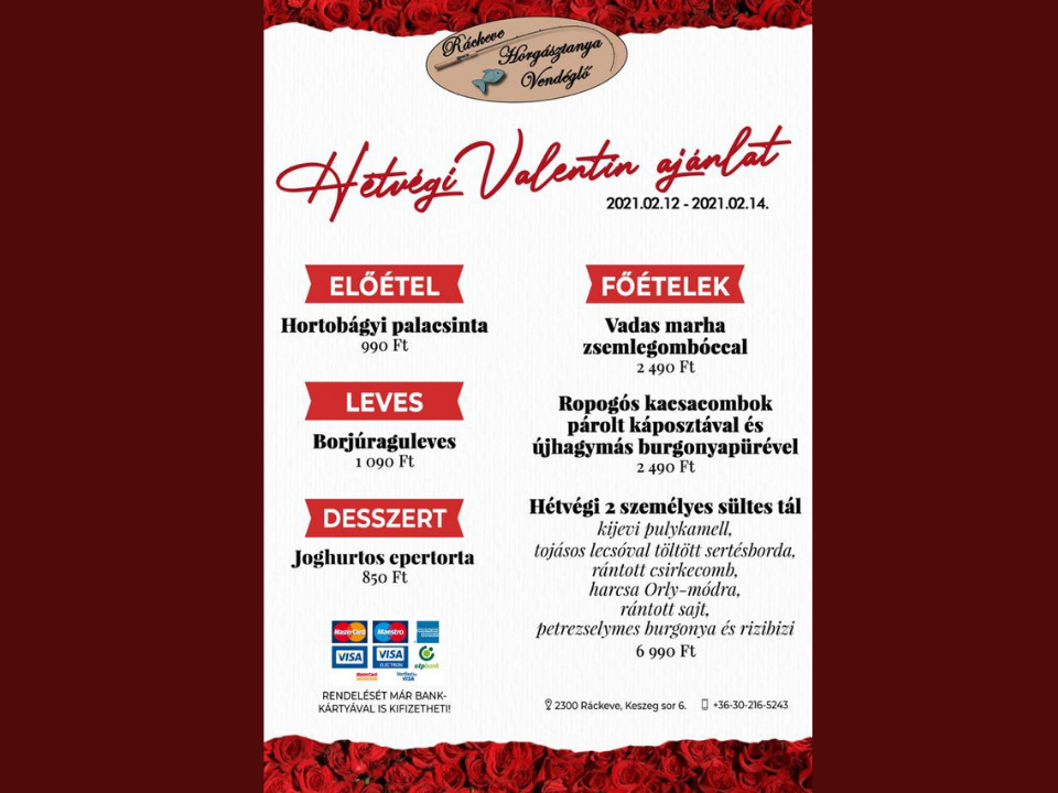 Naptár szerint most a tél végi aktualitásoké a főszerep. Elkezdődnek a diszkrét farsangolások, kis csoportokban, zárt közösségekben, élő videókban. Az érzelmekre ható ünnepek között a Valentin nap az első az évben, melyet napokon belül ünnepelhetünk, megtarthatunk. Ez megnyilvánulhat egy pusziban, egy ölelésben, egy ajándékban vagy egy figyelmességben. Normál esetben javában mennének az asztalfoglalások éttermeinkben, pásztáznátok az ajánlatokat, a cukrászdák szíves újdonságait. De a valóság az, hogy vendéglátóhelyeink küzdelmes hónapok közepette próbálnak talpon maradni a napi menükkel és az elviteles ételekkel. Arra gondoltam, hogy segítve őket és a Ti döntéseteket, tálcán nyújtom át Nektek a 2021-es év Valentin napi ajánlatait, melyet a város illetve a környék vendéglátóhelyei elviteles formában, de szívesen készítenek el, hogy az ízletes és romantikusra komponált ételek még finomabbra hangolják a hétvége szerelmes pillanatait. Alfabetikus sorrendben haladva íme a kínálat, éljetek vele!